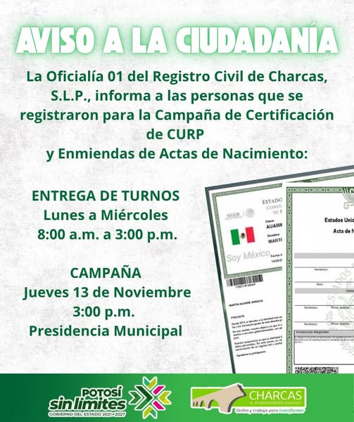 Se informa a las personas que serán beneficiadas con la Campaña de Certificación de CURP y Enmiendas de Actas de Nacimiento que deberán acudir a la Oficialía 01 del Registro Civil de Charcas a recoger su turno a más tardar el miércoles 12 de noviembre.