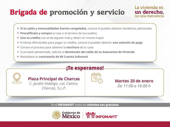 InicioCharcas¡Atención Charcas! Charcas ¡Atención Charcas! By La Razón del Altiplano 19 de enero de 2026 0 18 Cuota FacebookTwitterPinterestWhatsApp El INFONAVIT estará ofreciendo asesoría gratuita para tu crédito, escrituras y devolución de saldos.Lugar: Plaza Principal (Jardín Hidalgo)Fecha: Martes 20 de enero.Horario: 11:00 am a 4:00 pm. Cuota FacebookTwitterPinterestWhatsApp Artículo anteriorAtlético Charcas se corona campeón de Segunda Fuerza de la Liga Municipal de FútbolArtículo siguienteANTES Y DESPUÉS | AVENIDA LAS TORRES La Razón del Altiplanohttps://www.larazondelaltiplano.com.mx RELATED ARTICLES Charcas LA CALLE AMADO NERVO SE INTEGRA AL PROGRAMA DE PAVIMENTACIÓN MUNICIPAL DE CHARCAS. 21 de enero de 2026 Charcas Atlético Charcas se corona campeón de Segunda Fuerza de la Liga Municipal de Fútbol 18 de enero de 2026 Charcas SE SOFOCA INCENDIO EN CARRETERA ESTACIÓN LAGUNA – BERRENDO 17 de enero de 2026 Most Popular RICARDO GALLARDO ARRANCA MODERNIZACIÓN DE 200 COLONIAS DE LA ZONA METROPOLITANA 28 de enero de 2026 GOBIERNO DEL ESTADO REFUERZA OPERATIVO ANTE BAJAS TEMPERATURAS 28 de enero de 2026 RECONOCEN VALLENSES OBRAS Y APOYOS EN SALUD DE RICARDO GALLARDO 28 de enero de 2026 GOBIERNO DEL ESTADO IMPULSA FUNI 2026 PARA FORTALECER LA EDUCACIÓN SUPERIOR 28 de enero de 2026 Cargar más Recent Comments