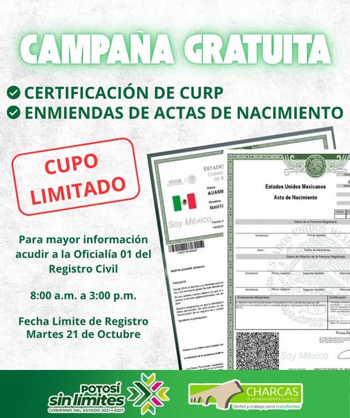 El H. Ayuntamiento de Charcas, a través de la Oficialía 01 del Registro Civil, en coordinación con la Dirección General del Registro Civil del Gobierno del Estado, invita a la ciudadanía a participar en esta campaña que tiene como objetivo facilitar y actualizar sus documentos oficiales.