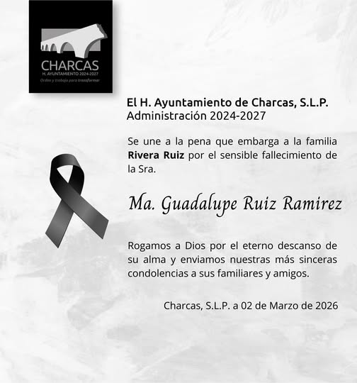 El H. Ayuntamiento de Charcas, S.L.P., Administración 2024-2027, expresa sus más sentidas condolencias por el sensible fallecimiento de la Sra. Ma. Guadalupe Ruiz Ramírez.