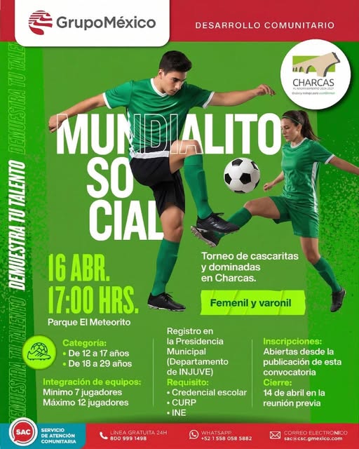 Grupo México Desarrollo Comunitario en coordinación con H. Ayuntamiento de Charcas te invitan al torneo de cascaritas y dominadas