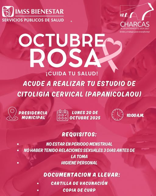 Asegura tu lugar y obtén tu ficha en el Departamento de Instancia de la Mujer del Ayuntamiento de Charcas, en un horario de 8:00 A.M. a 3:00 P.M. ¡La detección oportuna salva vidas! No lo dejes para después.