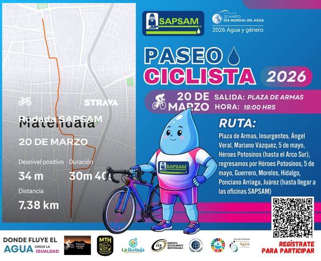 En el marco del Día Mundial del Agua 2026, bajo el tema “Agua y Género”, te invitamos a ser parte del Paseo Ciclista SAPSAM, actividad que promueve la participación ciudadana, el cuidado del agua y la construcción de una sociedad más igualitaria. Recuerda que aún estás a tiempo de registrarte y sumarte a este recorrido.