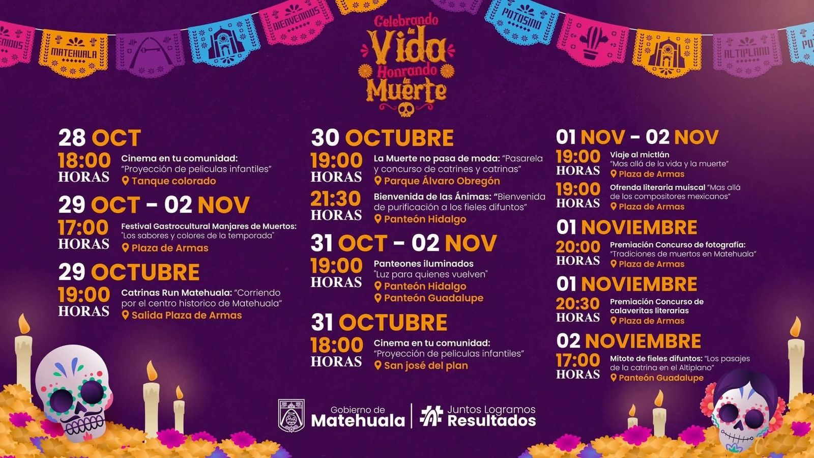 Con el propósito de fortalecer las tradiciones mexicanas y posicionar a Matehuala como un referente cultural en el Altiplano Potosino, el Gobierno Municipal presentó la programación oficial de “Día de Muertos 2025”, bajo el lema “Celebrando la vida, honrando la muerte”.