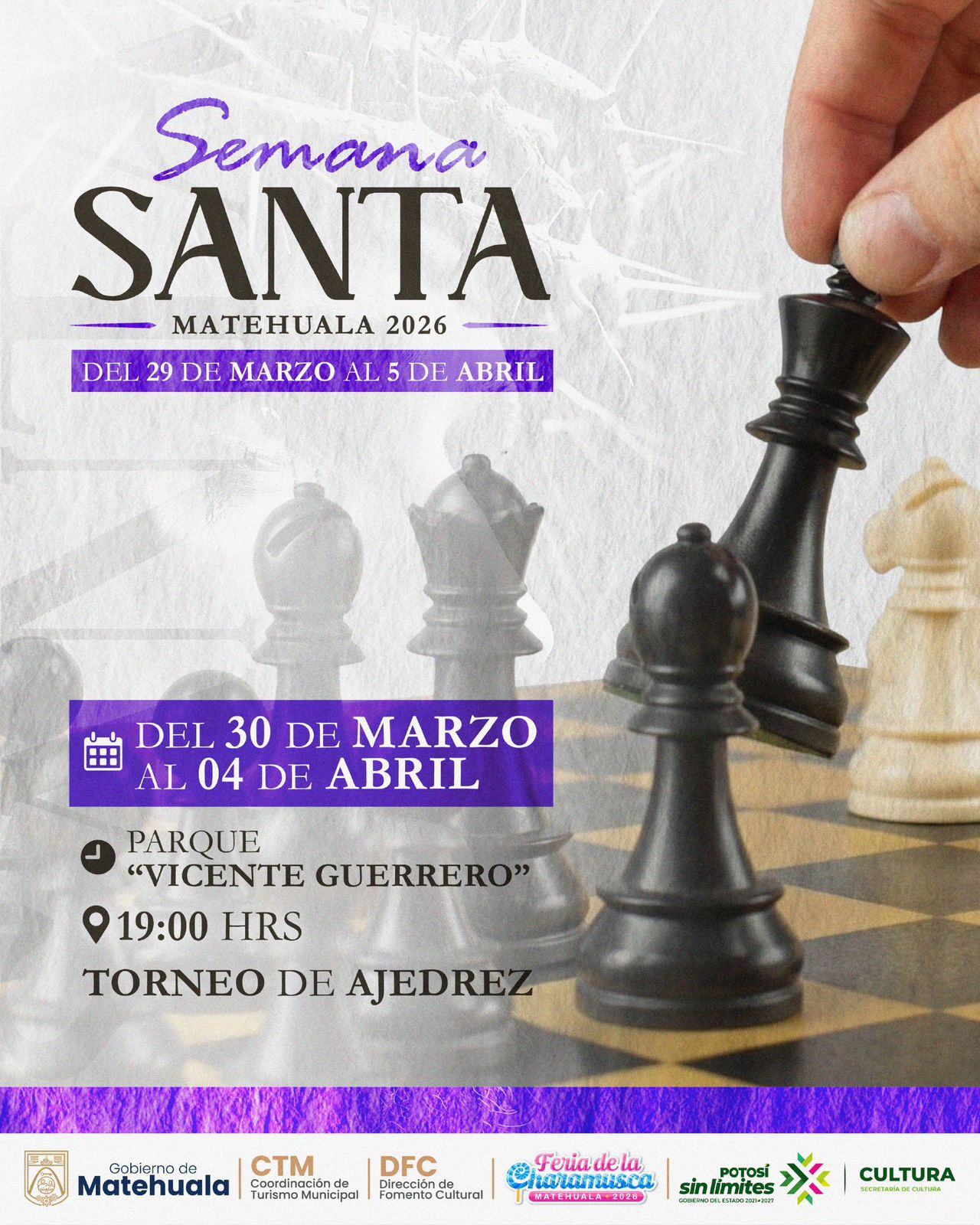 InicioEntretenimientoSEMANA SANTA MATEHUALA 2026 EntretenimientoEventosGobierno de Matehuala SEMANA SANTA MATEHUALA 2026 By La Razón del Altiplano 30 de marzo de 2026 0 28 Cuota FacebookTwitterPinterestWhatsApp ♟️ Torneo de Ajedrez📍 Parque Vicente Guerrero📅 Del 30 de marzo al 4 de abril | ⏰ 19:00 hrs Cuota FacebookTwitterPinterestWhatsApp Artículo anteriorSE SOLICITARÁ REVISIÓN OPORTUNA A COMISIONES LEGISLATIVAS PARA INICIATIVA DE PARLAMENTO DE LAS PERSONAS ADULTAS MAYORES.Artículo siguienteAVISO IMPORTANTE | CLASE 2007 Y REMISOS La Razón del Altiplanohttps://www.larazondelaltiplano.com.mx RELATED ARTICLES Entretenimiento SEMANA SANTA MATEHUALA 2026 31 de marzo de 2026 Gobierno de Matehuala AVISO IMPORTANTE | CLASE 2007 Y REMISOS 30 de marzo de 2026 Deportes CHIVAS, PUMAS Y TIGRES LLEGAN A MATEHUALA: TODO LISTO PARA LA COPA 2026 29 de marzo de 2026 Most Popular SEMANA SANTA MATEHUALA 2026 31 de marzo de 2026 AVISO IMPORTANTE | CLASE 2007 Y REMISOS 30 de marzo de 2026 SE SOLICITARÁ REVISIÓN OPORTUNA A COMISIONES LEGISLATIVAS PARA INICIATIVA DE PARLAMENTO DE LAS PERSONAS ADULTAS MAYORES. 29 de marzo de 2026 COMISIÓN DE DESARROLLO ECONÓMICO Y SOCIAL APRUEBA REFORMA PARA INCORPORAR EL CONCEPTO DE “ECONOMÍA SOCIAL” EN LA LEGISLACIÓN LOCAL 29 de marzo de 2026 Cargar más Recent Comments