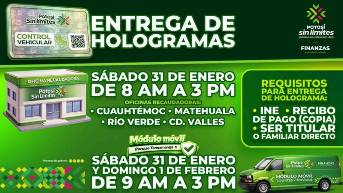 Con el cambio que se vive y se siente en la administración Estatal y para apoyar a las y los potosinos en la obtención del holograma 2026, este sábado 31 de enero se ampliará la atención en oficinas recaudadoras de Cuauhtémoc, Matehuala, Rioverde y Ciudad Valles, de 8:00 a 15:00 horas, exclusivamente para la entrega de hologramas a quienes realizaron su pago por medios electrónicos o bancarios.