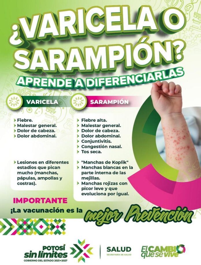El Gobierno del Estado de San Luis Potosí mantiene y refuerza la campaña informativa sobre la importancia de identificar oportunamente y prevenir el sarampión y la varicela, dos enfermedades contagiosas que se presentan con mayor frecuencia en la infancia.