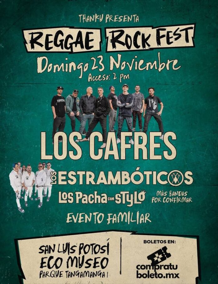 Gracias al clima de paz y estabilidad que genera el Gobierno del Estado de San Luis Potosí, la zona metropolitana continúa recibiendo espectáculos que fortalecen la vida cultural y el entretenimiento para el disfrute sin límites de las y los potosinos. Este domingo 23 de noviembre, el Eco Museo del Parque Tangamanga I será sede del Reggae Rock Fest, una propuesta musical que reunirá a familias y jóvenes en un ambiente seguro y de sana convivencia.