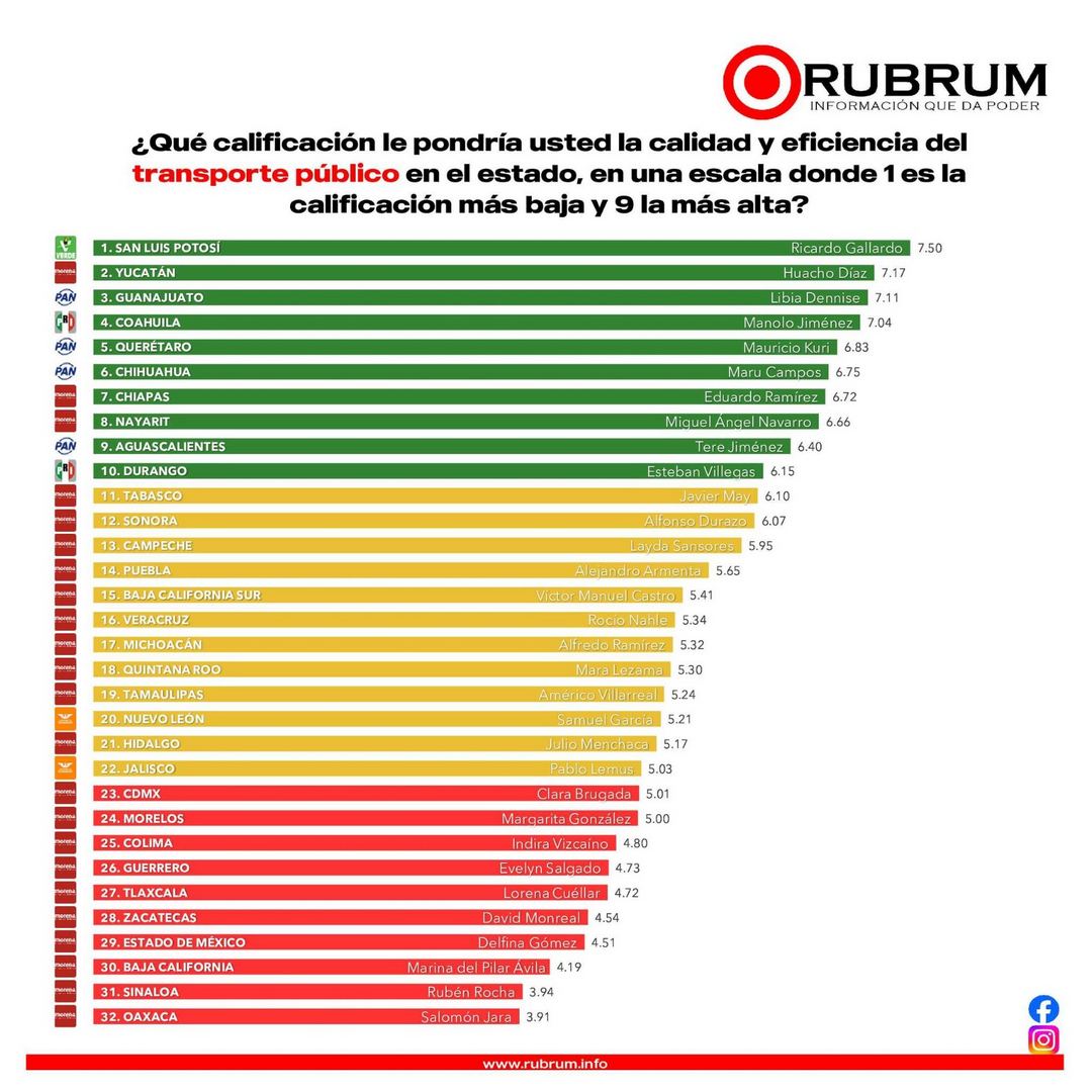La evaluación de RUBRUM también contempla áreas críticas de servicio social. El sistema estatal de salud obtuvo el sexto lugar nacional con una calificación de 6.12; mientras que en seguridad pública San Luis Potosí se posicionó en la séptima ubicación a nivel país.