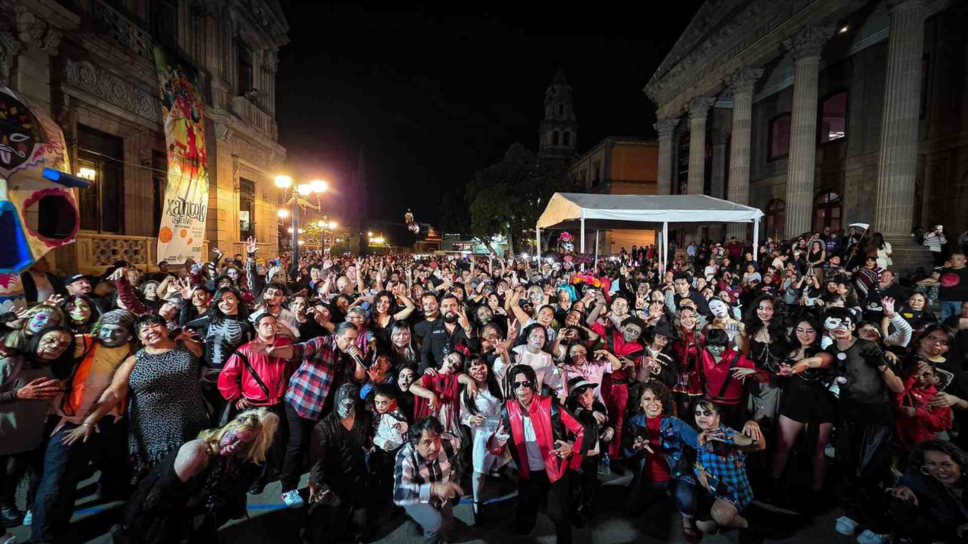 Miles de niñas, niños, jóvenes y adultos se sumaron a esta colorida coreografía que transformó el Centro Histórico en un escenario lleno de energía, creatividad y talento potosino. Disfrazados como zombis y personajes emblemáticos del clásico musical, los participantes dieron vida a un espectáculo que fortaleció la convivencia social y el orgullo cultural de San Luis Potosí.