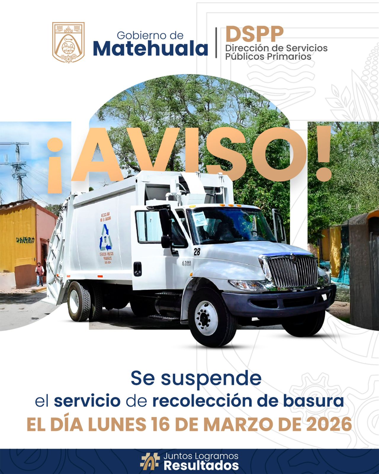El Gobierno Municipal de Matehuala, a través de la Dirección de Servicios Públicos Primarios, informa a la ciudadanía que el servicio de recolección de basura se suspenderá el día lunes 16 de marzo de 2026. Se invita a la población a tomar sus precauciones y evitar sacar los residuos a la vía pública durante ese día. Agradecemos su comprensión y colaboración para mantener limpia nuestra ciudad. JuntosLogramosResultados
