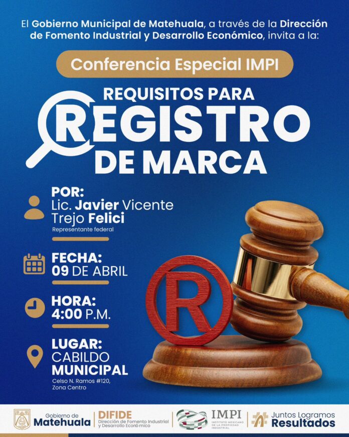 El Gobierno Municipal de Matehuala, a través de la Dirección de Fomento Industrial y Desarrollo Económico, invita a emprendedores, empresarios y público en general a participar en esta importante conferencia sobre los requisitos para el registro de marca.