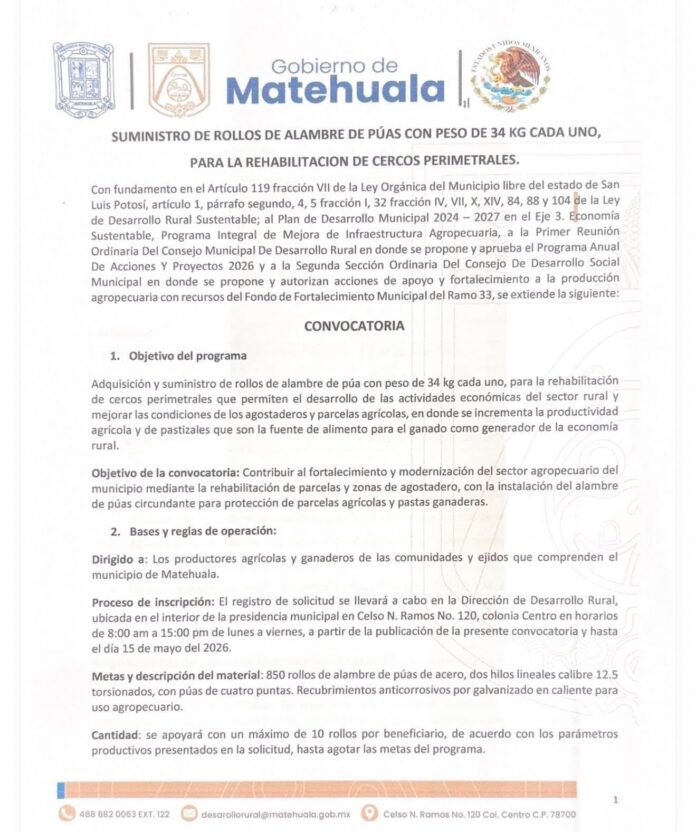 El Gobierno Municipal invita a las y los productores del sector agropecuario a participar en este programa para la rehabilitación de cercos perimetrales y fortalecimiento del campo. 🌾🐄