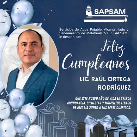 El Organismo Operador de Servicios de Agua Potable, Alcantarillado y Saneamiento de Matehuala (SAPSAM) extiende una calurosa felicitación a nuestro presidente municipal, Lic. Raúl Ortega Rodríguez, deseándole un cumpleaños lleno de salud, prosperidad y alegría junto a sus seres queridos. Que este nuevo año de vida esté colmado de éxitos y siga siendo fuente de inspiración para continuar trabajando juntos por un Matehuala mejor.