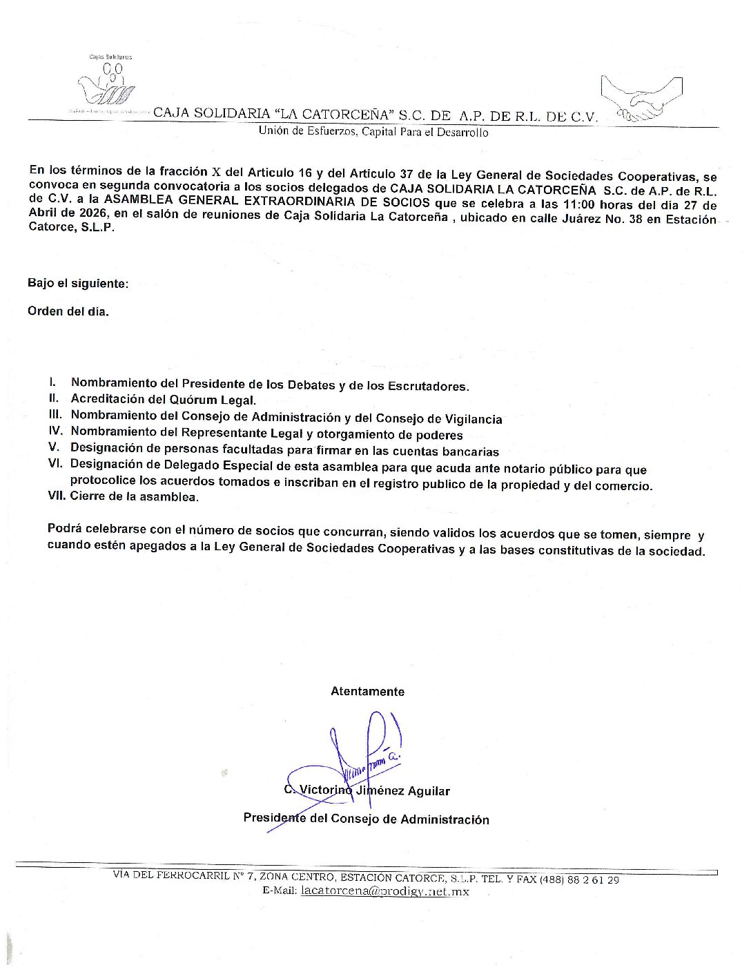 Segunda convocatoria, CAJA SOLIDARIA LA CATORCEÑA, S.C. DE A.P. DE R.L. DE C.V., Convoca a la asamblea general extraordinaria.