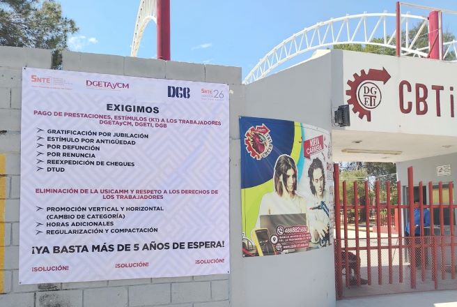 En el CBTis 151 de Matehuala y en otros 10 planteles del estado fueron colocadas de forma simultánea mantas alusivas a la falta de pago, con las que empleados y jubilados de estas escuelas exigen de inmediato el pago de prestaciones distintas que no les ha liberado la Subsecretaría de Educación Media Superior.