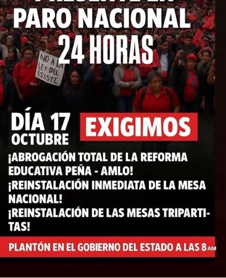 En el paro nacional por 24 horas al que convocan, los miembros del magisterio también exigirán la reinstalación inmediata de la Mesa Nacional y reinstalación de las Mesas Tripartitas entre la SEP, el gobierno estatal y las representaciones sindicales.