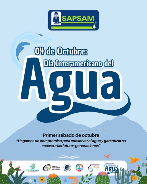 Cada primer sábado de octubre se celebra el Día Interamericano del Agua, una fecha instaurada en 1993 por la Organización Panamericana de la Salud (OPS) y la Asociación Interamericana de Ingeniería Sanitaria y Ambiental (AIDIS), con el propósito de sensibilizar a la población sobre la importancia del agua y la necesidad de cuidarla como un recurso vital e irremplazable. En este marco, SAPSAM reafirma su compromiso de fomentar la Cultura del Agua, fortalecer la educación ambiental y promover la cooperación interinstitucional, para garantizar que el agua continúe siendo un derecho humano y un recurso protegido para las generaciones presentes y futuras. Por una seguridad hídrica ¡Cuidemos el Agua!