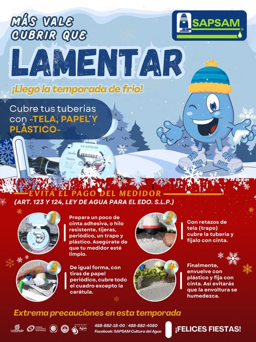 Con la llegada de las bajas temperaturas, nuestras tuberías y medidores se vuelven vulnerables al congelamiento, provocando fugas, roturas y fallas en el sistema sanitario. Protegerlos es esencial para evitar daños, cuidar el agua y mantener un servicio estable durante toda la temporada. Para cubrir tu medidor, sigue estos pasos: prepara cinta adhesiva o hilo resistente, periódico, trapo y plástico; cubre primero la tubería con tela, después añade periódico sin tapar la carátula y finaliza envolviendo todo con plástico para evitar la humedad.