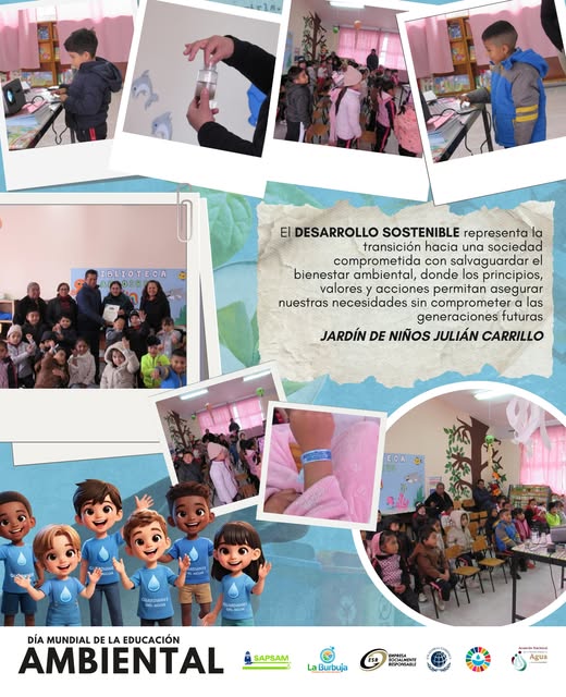 Como parte de nuestra campaña por el Día Mundial de la Educación Ambiental, enfocada en fomentar valores, principios y acciones en favor del bienestar ambiental, el Organismo Operador SAPSAM llevó a cabo una serie de pláticas y actividades dirigidas a alumnos de nivel preescolar, con el objetivo de fortalecer desde temprana edad la cultura del cuidado del agua y del medio ambiente. Visitamos el Jardín de Niños Julián Carrillo. Durante las actividades, los niños aprendieron sobre la importancia del agua en su comunidad, compartiendo momentos de aprendizaje y convivencia con docentes y compañeros. Agradecemos a la institución por haber abierto sus puertas a esta iniciativa. Su participación es fundamental para seguir construyendo un futuro donde el desarrollo vaya de la mano con el cuidado del planeta. Por una Seguridad Hídrica ¡Cuidemos el Agua!
