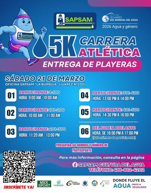 ¡Todo listo para la Carrera Atlética 5K 2026! Te compartimos los horarios de entrega de playeras y números de participante, la cual se llevará a cabo este sábado 21 de marzo en las oficinas SAPSAM “La Burbuja” (Juárez #1200).
