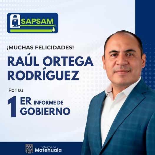 Los Servicios de Agua Potable, Alcantarillado y Saneamiento de Matehuala, S.L.P. (SAPSAM), felicitan al Lic. Raúl Ortega Rodríguez, presidente municipal de Matehuala, por su primer informe de resultados. Reafirmamos nuestro compromiso de trabajar con responsabilidad y dedicación para brindar un servicio eficiente a la ciudadanía, fortaleciendo la infraestructura hidráulica y contribuyendo al bienestar de las familias matehualenses.