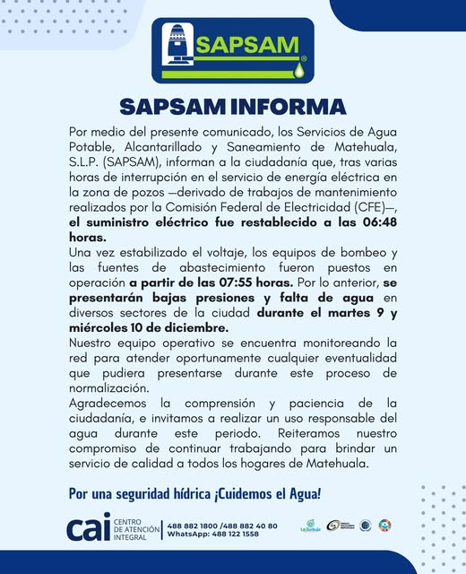 Tras la interrupción eléctrica registrada en la zona de pozos debido a los trabajos de mantenimiento realizados por la Comisión Federal de Electricidad (CFE), informamos que el servicio fue restablecido a las 06:48 horas. Una vez estabilizado el voltaje, nuestros equipos de bombeo y fuentes de abastecimiento comenzaron operaciones a partir de las 07:55 horas.
