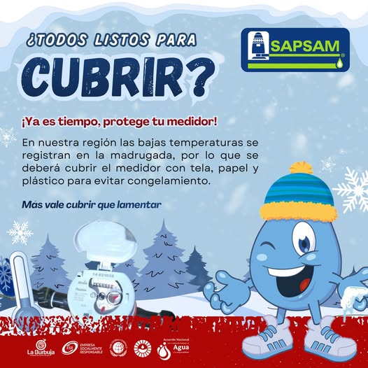 En temporada de invierno, los frentes fríos ponen en riesgos nuestros medidores y tuberías, provocando roturas, daños por congelación y desperdicio de agua. Evitemos gastos innecesarios. Cubre tu medidor con tela, papel y plástico para evitar congelamiento ¿Estás listo? Por una seguridad hídrica ¡Cuidemos el Agua!