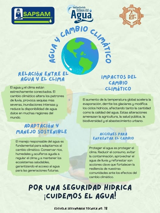 ESC. Secundaria Técnica No. 78 “Agua y Cambio Climático El agua y el cambio climático, mantienen una relación directa y crítica. El aumento de la temperatura global, la alteración de los patrones de lluvia y los fenómenos meteorológicos extremos provocados por actividades humanas como la quema de combustibles fósiles, la deforestación y la contaminación, impactan gravemente la disponibilidad y calidad del agua. Entre los principales efectos destacan la escasez hídrica en regiones afectadas por sequías prolongadas y, en contraste, inundaciones que deterioran fuentes de agua y dañan la infraestructura urbana. Estos cambios repercuten en diversos ámbitos: