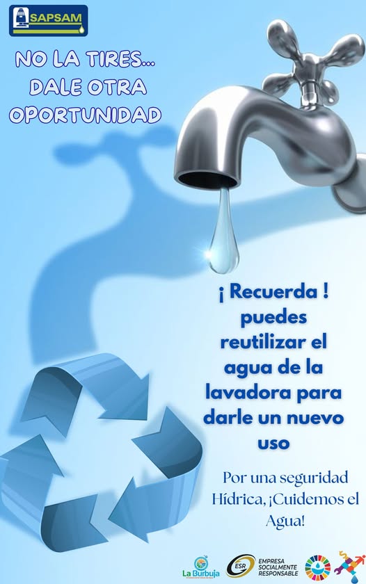 El agua es un recurso indispensable para nuestra vida diaria y cada vez es más importante usarla de manera responsable, una forma sencilla de hacerlo es darle un segundo uso al agua de la lavadora, en lugar de desecharla, puedes aprovecharla para limpiar pisos, banquetas, patios o para el riego de plantas ornamentales. Pequeñas acciones en casa generan un gran impacto cuando todos participamos, reducir el desperdicio de agua ayuda a conservar nuestros recursos naturales y fortalece el compromiso con el medio ambiente y con las futuras generaciones al igual que contribuimos al ahorro. Por una seguridad hídrica ¡Cuidemos el agua! #SAPSAM#CulturaDelAgua#CulturaHídrica