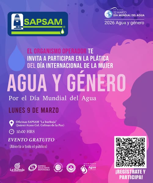 En el marco del Día Internacional de la Mujer (8M), fecha que nos recuerda la fortaleza, resiliencia y el esfuerzo de miles de mujeres profesionistas, estudiantes, madres y trabajadoras que día a día contribuyen al desarrollo de nuestras comunidades, el organismo operador SAPSAM invita al público en general a participar en la plática “Agua y Género”. Este espacio busca reflexionar sobre la importancia de la igualdad de oportunidades y el papel fundamental de las mujeres en la gestión y cuidado del agua. La actividad se realizará el lunes 9 de marzo a las 10:00 a.m. en las oficinas de SAPSAM “La Burbuja”, ubicadas en Juárez #1200, Col. Colinas de la Paz. La entrada es gratuita y está abierta a todas las personas interesadas Regístrate ahora en el siguiente enlace: https://docs.google.com/forms/d/e/1FAIpQLSeFz4Ea2uRjTqp1iGbBTKsvd9e_ifY3txrnFuSYjLJrjZcbNQ/viewform?usp=dialog ¡Donde fluye el agua, crece la igualdad!