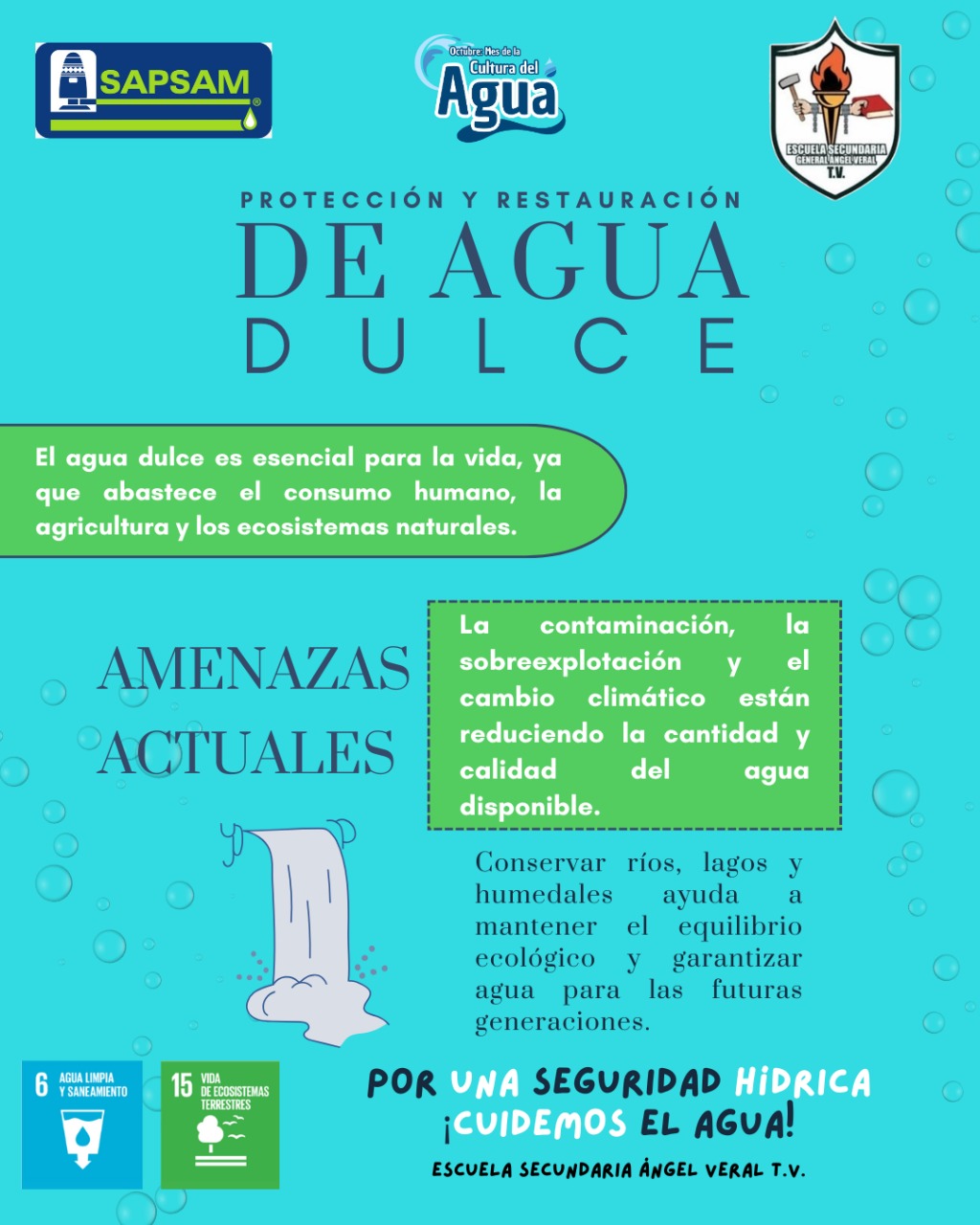 Continuamos con nuestras actividades del Mes de la Cultura del Agua, visitando la Escuela Secundaria Ángel Veral T.V., donde los alumnos presentaron el tema “Protección y restauración de agua dulce”. A través de su exposición, reflexionaron sobre la importancia de cuidar nuestros ríos, lagos y mantos acuíferos para garantizar un futuro sostenible. Agradecemos la entusiasta participación de la comunidad educativa por sumarse a esta campaña que busca fortalecer la conciencia ambiental y el compromiso con el uso responsable del agua. Construyendo una nueva cultura hídrica. ¡Cuidemos el Agua!