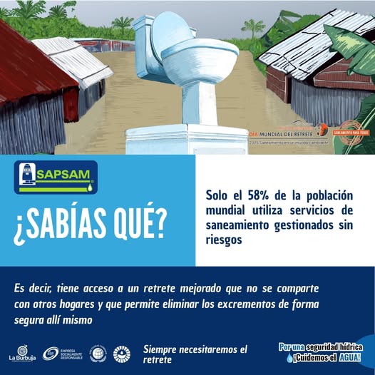 Solo el 58% de la población mundial cuenta con servicios de saneamiento seguros, es decir, con un retrete mejorado que no se comparte con otros hogares y que permite eliminar los desechos de forma higiénica y sin riesgos. Este dato nos recuerda la importancia de garantizar instalaciones dignas para proteger la salud y el agua en todo el mundo. El saneamiento es un pilar fundamental para prevenir enfermedades, cuidar los ecosistemas y asegurar calidad de vida. Promover baños seguros, limpios y accesibles es una tarea colectiva que requiere educación, infraestructura y responsabilidad social. Por una seguridad hídrica ¡Cuidemos el Agua!