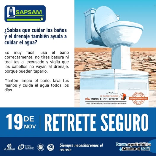 Cuidar los baños y el drenaje también es una forma directa de proteger el agua. Un buen uso del retrete evita taponamientos, fugas y contaminación. Es sencillo: no tires basura, toallitas o cabello al excusado, ya que estos materiales pueden obstruir el sistema y generar problemas en toda la red sanitaria. Mantener limpio el baño y usarlo correctamente ayuda a que el agua siga fluyendo hacia donde debe. Recordemos que cada acción cuenta. Mantén hábitos de higiene, evita tirar residuos en el drenaje y protege el sistema sanitario de tu hogar y tu comunidad. Cuidar el saneamiento es cuidar nuestra salud y el recurso más valioso que tenemos. Por una Seguridad Hídrica ¡Cuidemos el Agua!