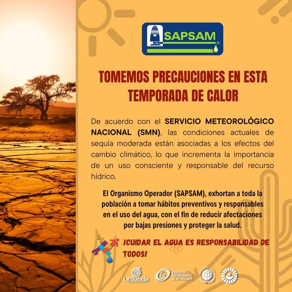 Ante la sequía moderada y la próxima temporada de calor, los Servicios de Agua Potable, Alcantarillado y Saneamiento de Matehuala S.L.P. SAPSAM, exhortan a la población a adoptar hábitos preventivos y responsables, con el fin de reducir afectaciones por bajas presiones y proteger la salud. Te recomendamos: