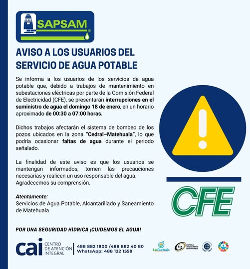 Se informa a los usuarios del servicio de agua potable que, debido a trabajos de mantenimiento en subestaciones eléctricas por parte de la CFE, se presentarán interrupciones en el suministro el domingo 18 de enero, de 00:30 a 07:00 horas. Dicha situación provocará bajas presiones y faltas de agua los días lunes 19 y martes 20, en toda la ciudad de Matehuala, se recomienda almacenar agua en la mayor medida posible así como hacer un uso eficiente del agua.