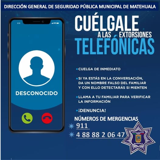 La Dirección General de Seguridad Pública Municipal de Matehuala exhorta a la ciudadnia a tener cuidado y no contestar llamadas de números desconocidos o con ladas de otros estados, ya que se están registrando llamadas de extorsión telefonica, algunos afcetados ya han depositado dinero al caer en el juego de los delincuentes.