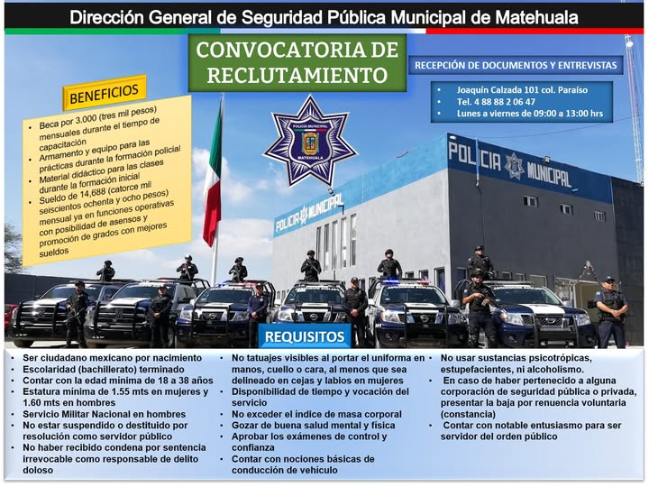 La Dirección General de Seguridad Pública Municipal de Matehuala, continua con el proceso de selección y reclutamiento para la nueva generación y formación de cadetes que en un futuro se agregarán a las filas de la Policía Municipal de Matehual en las funciones de Prevención y disución de delitos, asi como de proximidad social en materia de Seguridad, para dar cumplimiento a lo establecido por el Secretariado Ejecutivo del Consejo Estatal de Seguridad Pública de SLP.