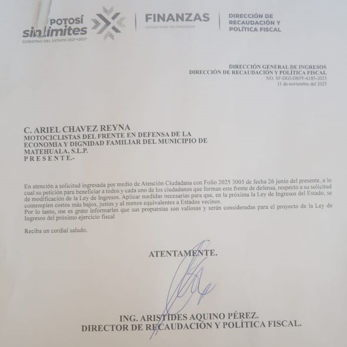 El Gobierno del estado respondió a una solicitud firmada por un grupo de ciudadanos que conformaron un frente en Matehuala, quienes solicitaron de manera oficial que se aplicaran medidas necesarias para que miles de motociclistas puedan regularizar sus vehículos.